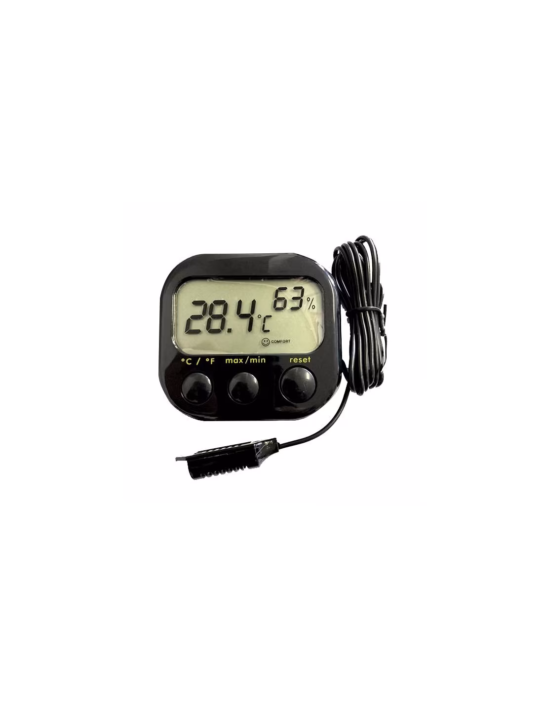 Este termómetro e higrómetro com sonda remota de temperatura e humidade (1,05 metros) possui função min/max, display digital de 6,5x3,2cm e modo de exibição em °Celsius ou °Fahrenheit. A parte traseira é magnética, mas também pode pousá-lo ou pendurá-lo.