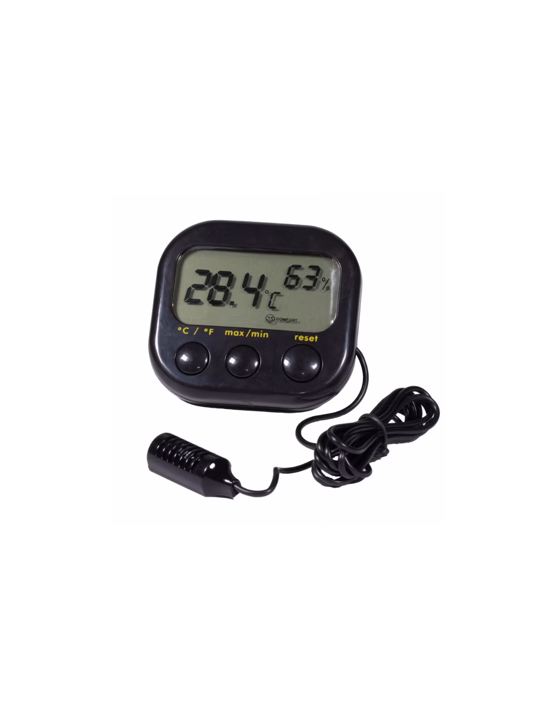 Termohigrómetro digital com tela grande para registrar temperaturas máximas e mínimas entre –10 e + 50ºC.
