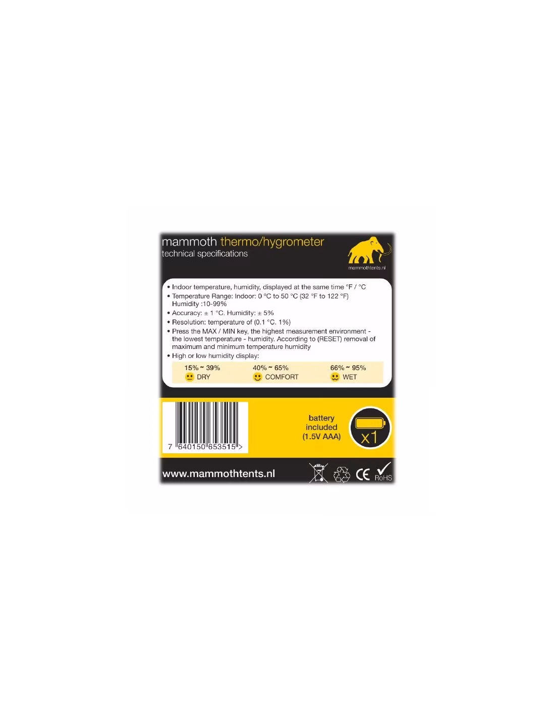 - Exibição de humidade alta ou baixa: 15-39% - Seco, 40-65% Conforto, 65-95% Húmido